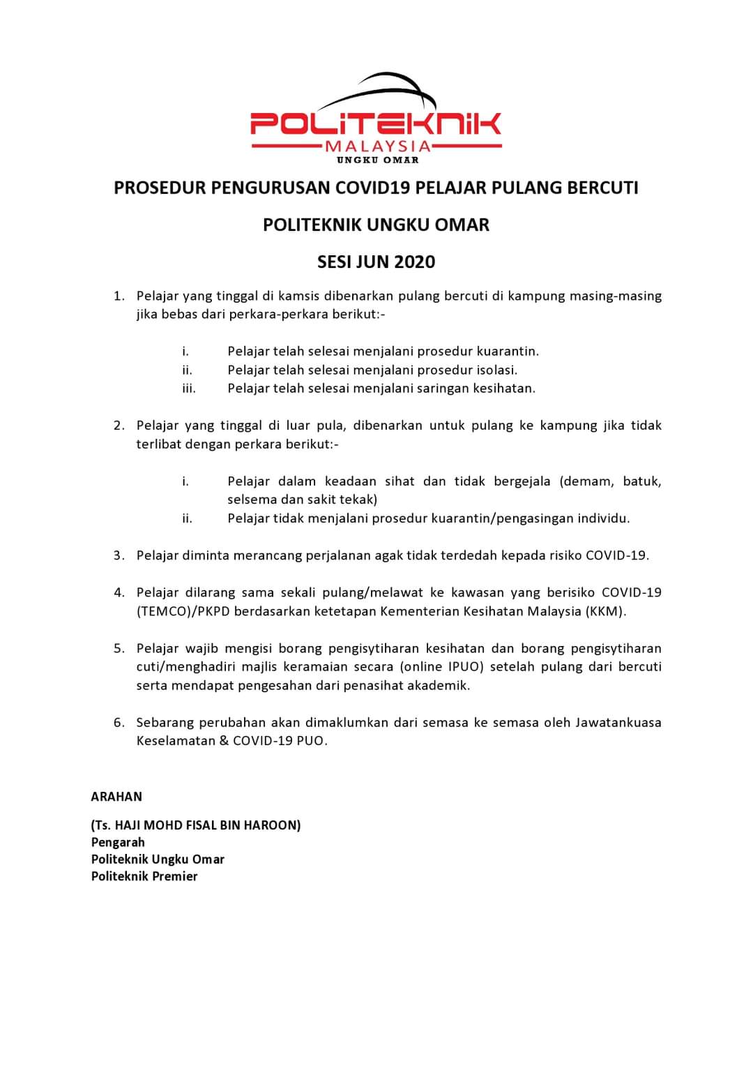 Ungku Omar Poly Su Twitter Prosedur Pengurusan Covid19 Pelajar Pulang Bercuti Politeknik Ungku Omar Sesi Jun 2020 Https T Co L6zi90cgms Twitter